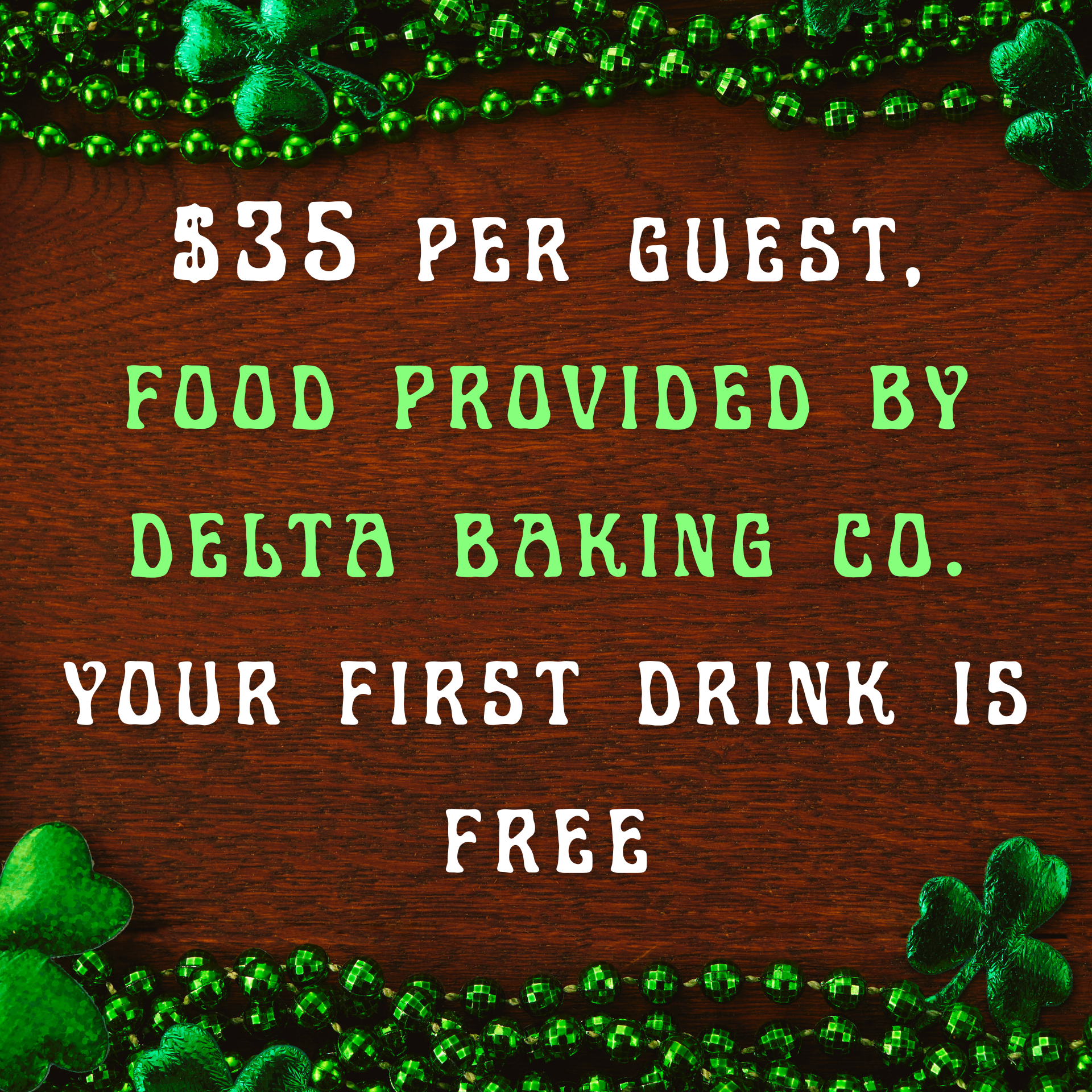 For $35 per guest, enjoy a delicious set menu prepared by Delta Baking Co., plus your first drink on us.